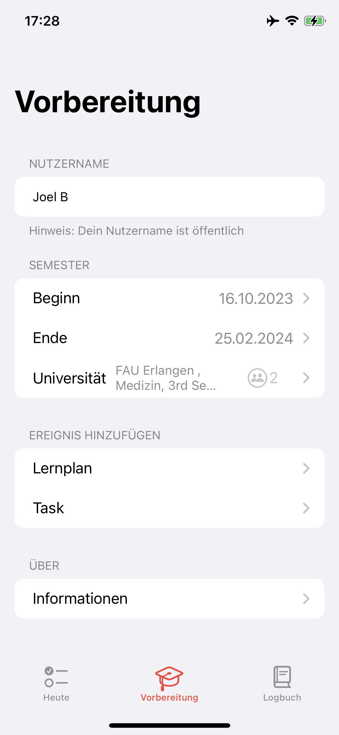 Die App-Idee für "Students" ist entstanden und die ersten beiden Versionen enthalten ein Grundgerüst mit einer Wochen-Ansicht, in der man Aufgaben hinzufügen kann und einen Lernplan mit einem Lernmodus.